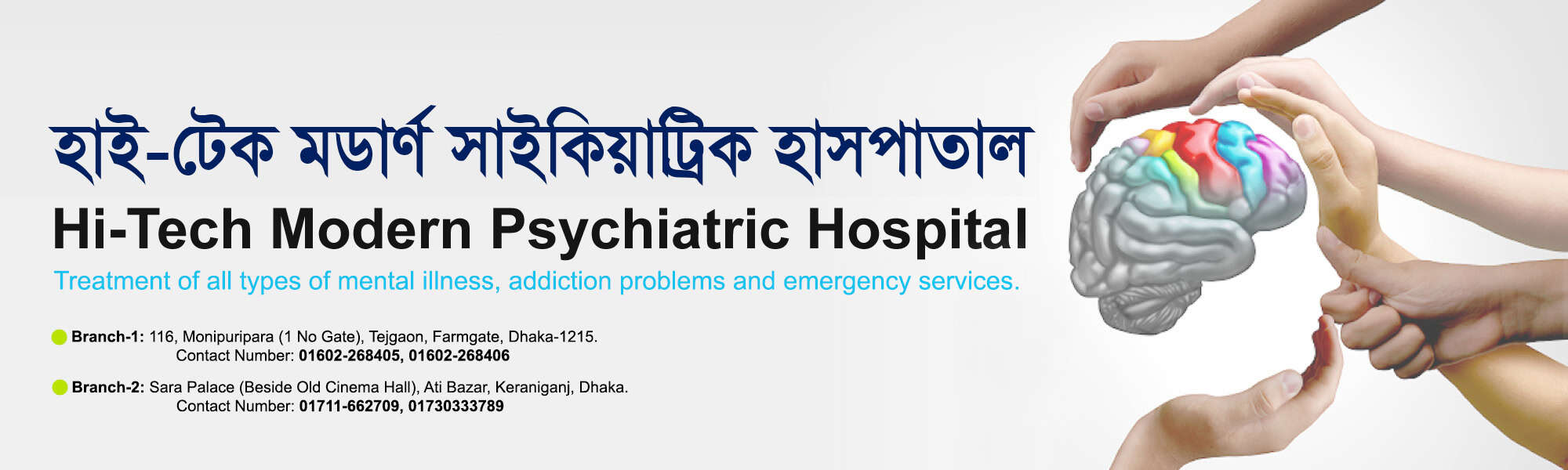 Hi-Tech Modern Psychiatric Hospital. Branch-1: 116, Monipuripara (1 No Gate), Tejgaon, Farmgate, Dhaka-1215. Branch-2: Sara Palace (Beside Old Cinema Hall), Ati Bazar, Keraniganj, Dhaka.